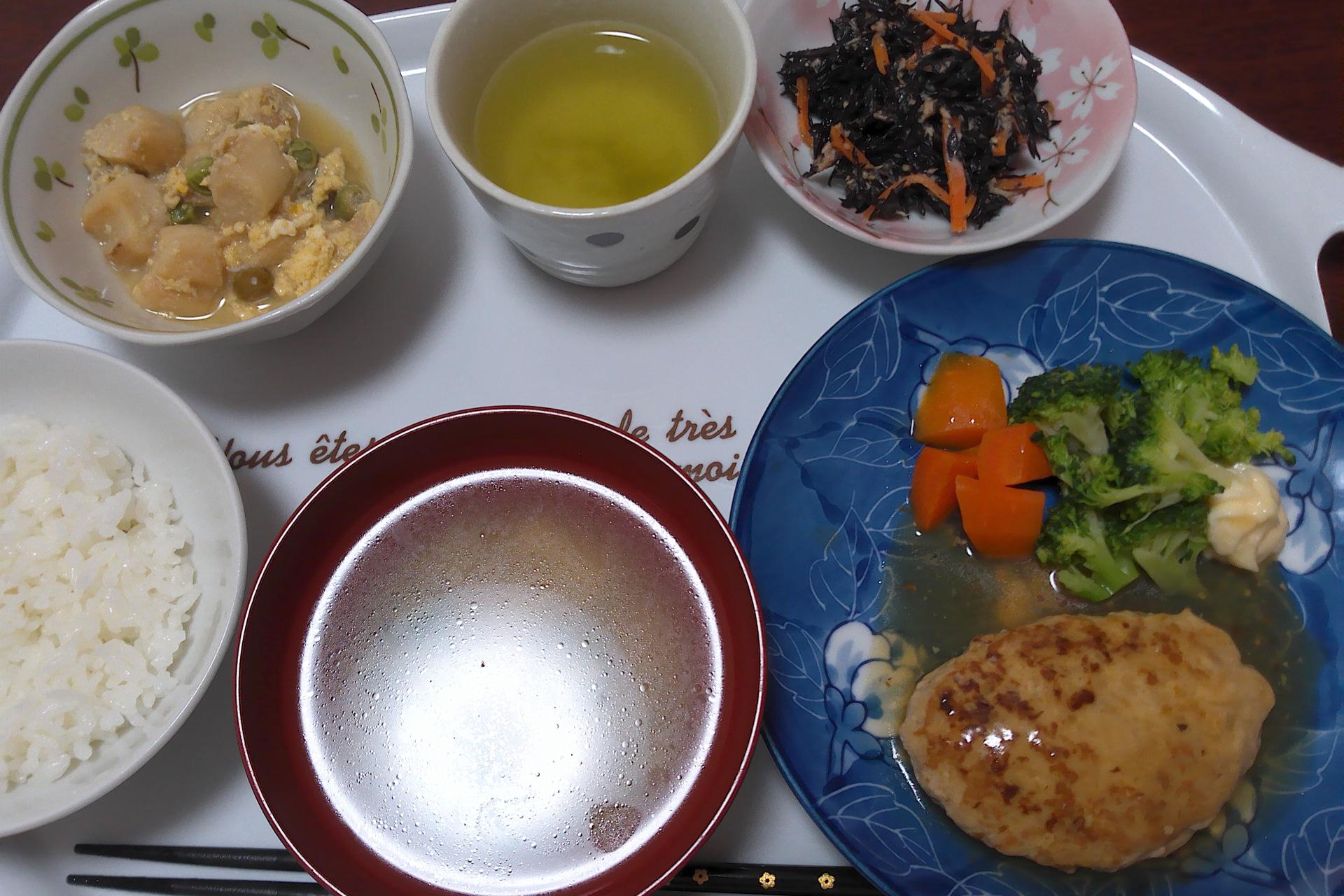 やわらかくて食べやすい和風ハンバーグとひじきサラダでさっぱりと、麩の卵とじはやさしい味わいでほっと一息♪